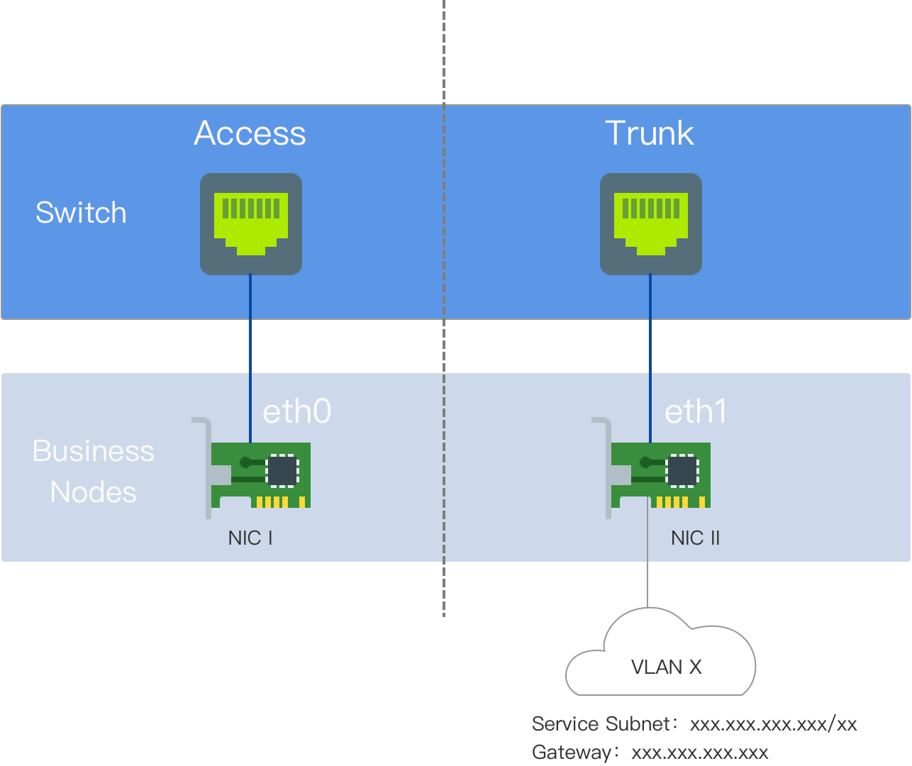 NIC Two: The NIC without the default route and not configured with an IP address, interconnected with the external switch interface, which is set to Trunk mode. The Underlay subnet exclusively uses NIC Two.