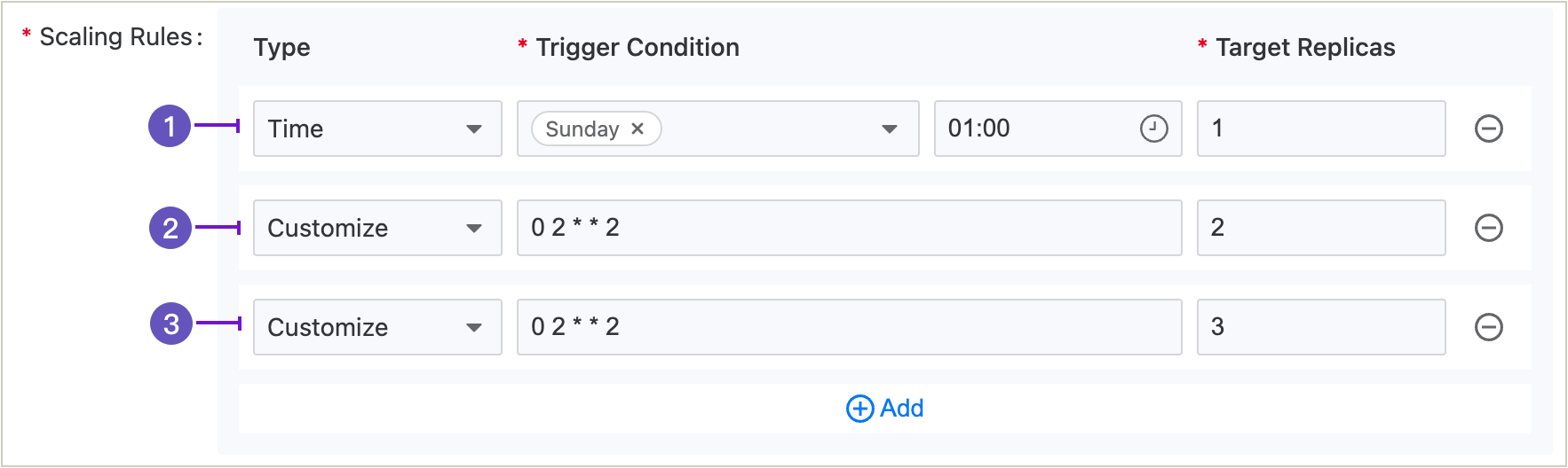 • When multiple rules have the same trigger time (Examples 2 and 3), the platform will execute automatic scaling based only on the rule that is higher in priority (Example 2).