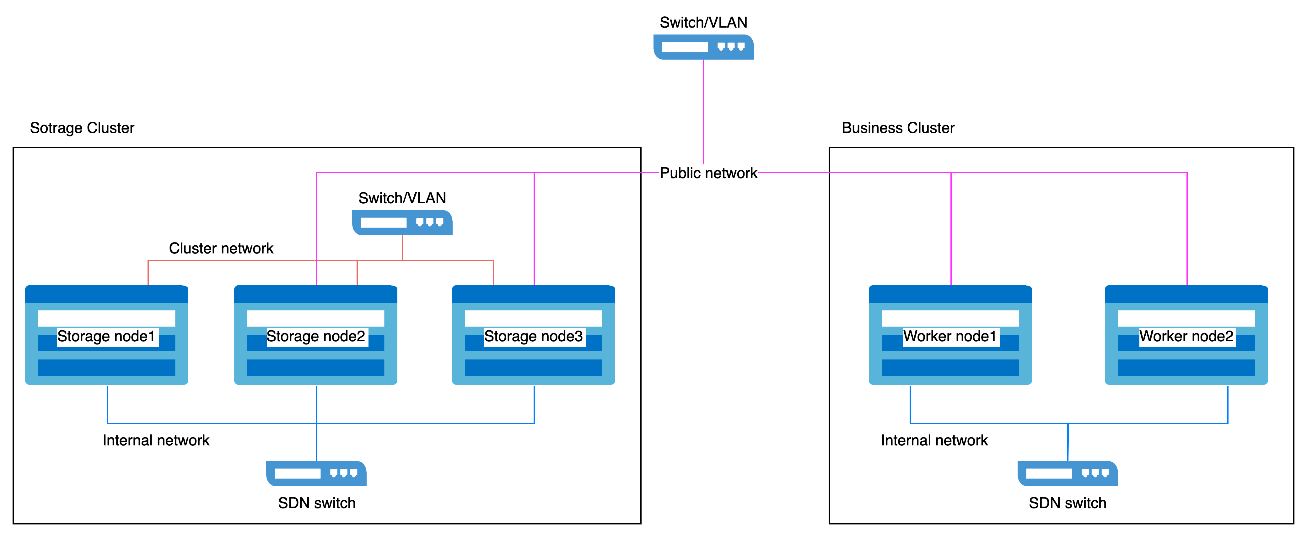 - Public Network: Used for client-to-storage component interactions (e.g., I/O requests).